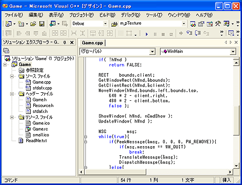 すると、画面は左図のようになったはずです。 Game.cpp の内容が表示されているはずです。 |